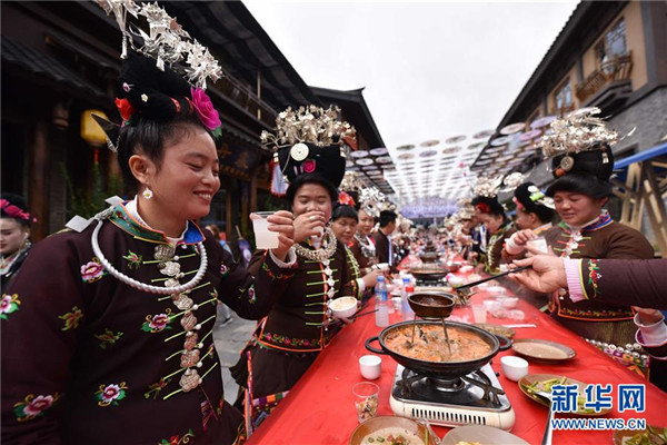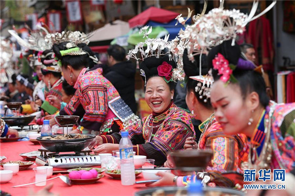 10月18日,游客在貴州省丹寨縣萬(wàn)達(dá)小鎮(zhèn)吃新節(jié)長(zhǎng)桌宴上品嘗佳肴。當(dāng)日,貴州省黔東南苗族侗族自治州丹寨縣萬(wàn)達(dá)小鎮(zhèn)舉辦苗族吃新節(jié)體驗(yàn)活動(dòng)。當(dāng)?shù)孛缱逋J笙舞、品長(zhǎng)桌宴,并邀請(qǐng)游客參與其中,大家在歡聲笑語(yǔ)中樂(lè)享金秋。新華社發(fā)(陸德華攝)