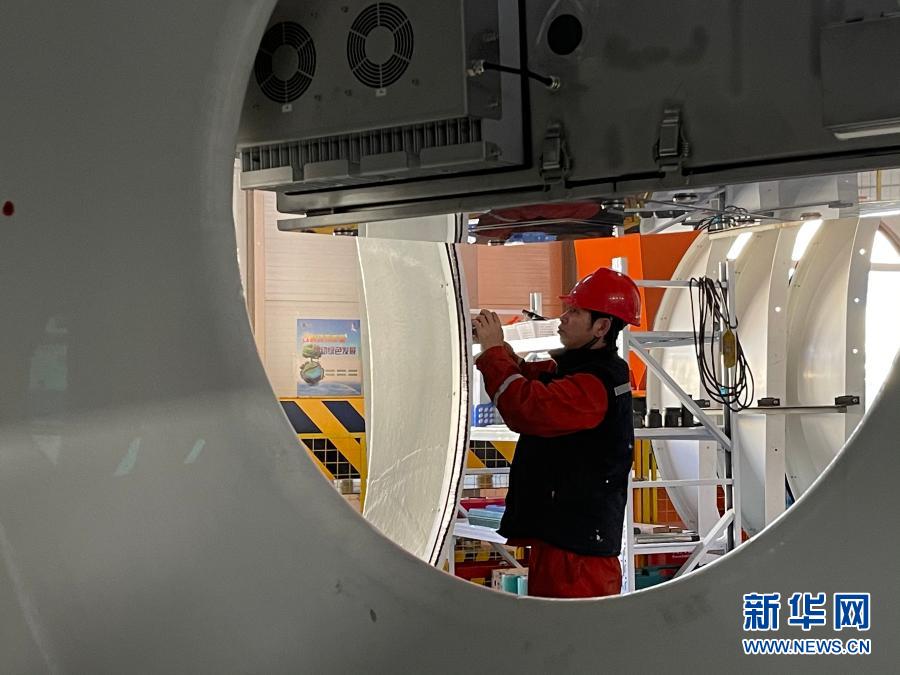 11月26日,在金風(fēng)風(fēng)電設(shè)備科技有限公司生產(chǎn)車間,工人在加工風(fēng)機組件?!⌒氯A社記者 安路蒙 攝