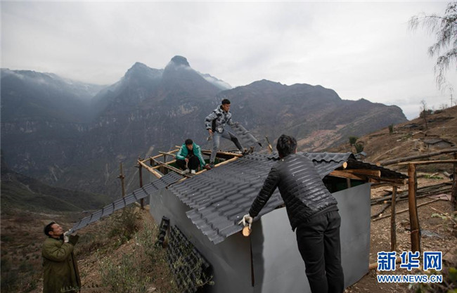 12月23日,某色蘇不惹(右二)和同伴在懸崖村修民宿。新華社記者 江宏景 攝