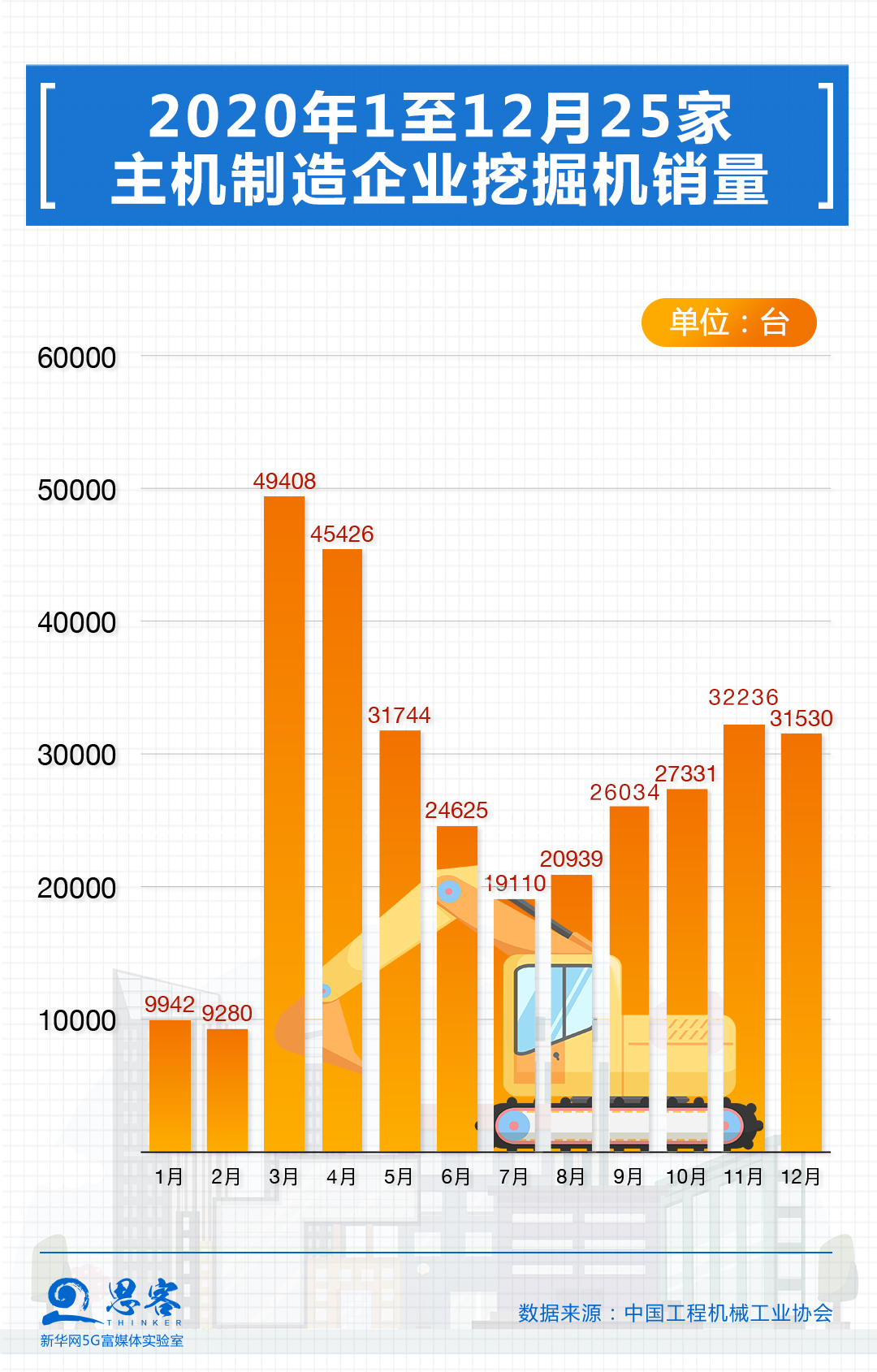 挖掘機(jī)銷量素有中國經(jīng)濟(jì)“溫度計(jì)”之稱。據(jù)中國工程機(jī)械工業(yè)協(xié)會(huì)統(tǒng)計(jì),2020年12月納入統(tǒng)計(jì)的25家挖掘機(jī)制造企業(yè)共銷售各類挖掘機(jī)31530臺,同比增長56.4%;全年共銷售挖掘機(jī)327605臺,同比增長39%。從百萬億里程碑和挖掘機(jī)銷量增長的背后,我們看到了怎樣的中國經(jīng)濟(jì)活力與圖景?