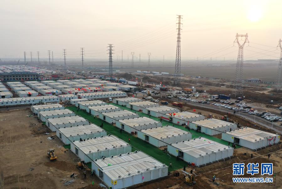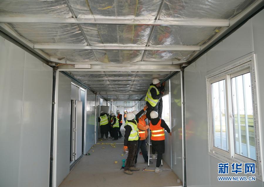 1月18日,在河北省石家莊市黃莊公寓隔離場所項(xiàng)目工地,工人在安裝集成房屋。新華社記者 楊世堯 攝