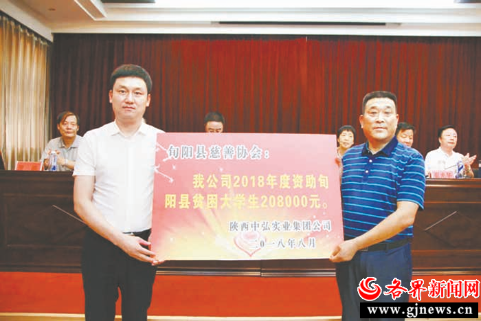 2018年8月,省政協(xié)委員、陜西中弘實(shí)業(yè)集團(tuán)有限公司董事長(zhǎng)徐浩向旬陽縣貧困大學(xué)生捐贈(zèng)善款。