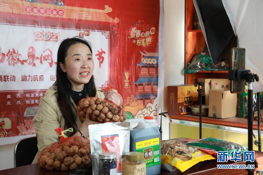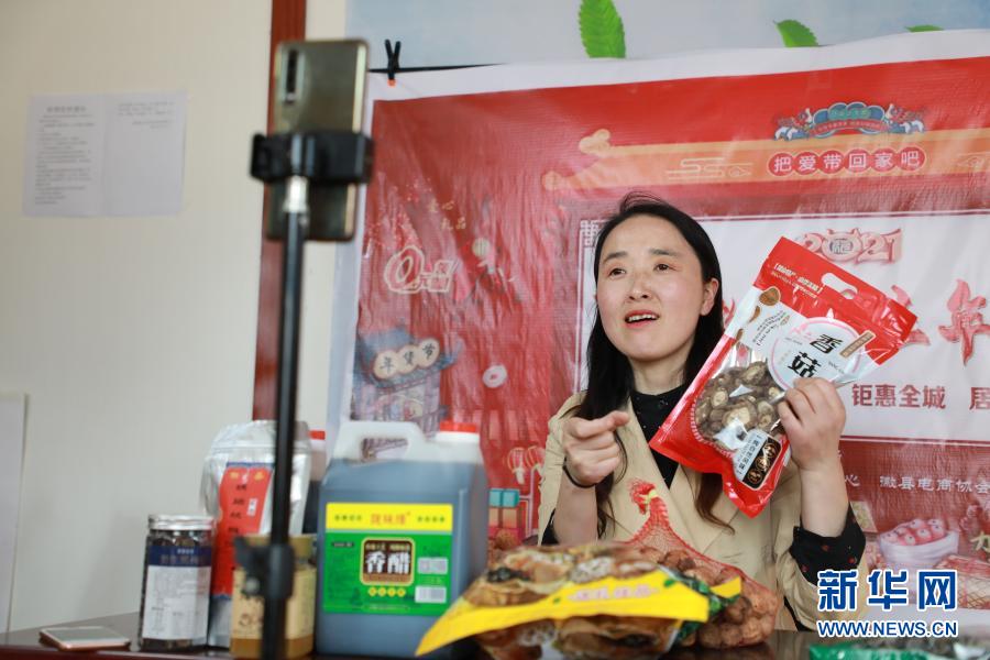 2月23日,在位于甘肅隴南市徽縣的店鋪中,全國人大代表梁倩娟在網上直播銷售當地農特產品?!⌒氯A社記者 張智敏 攝
