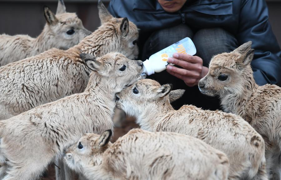 2020年7月7日,三江源國家公園管理局長江源園區(qū)可可西里管理處卓乃湖保護(hù)站的工作人員才文多杰在給藏羚羊幼仔喂奶。新華社記者 薛玉斌 攝