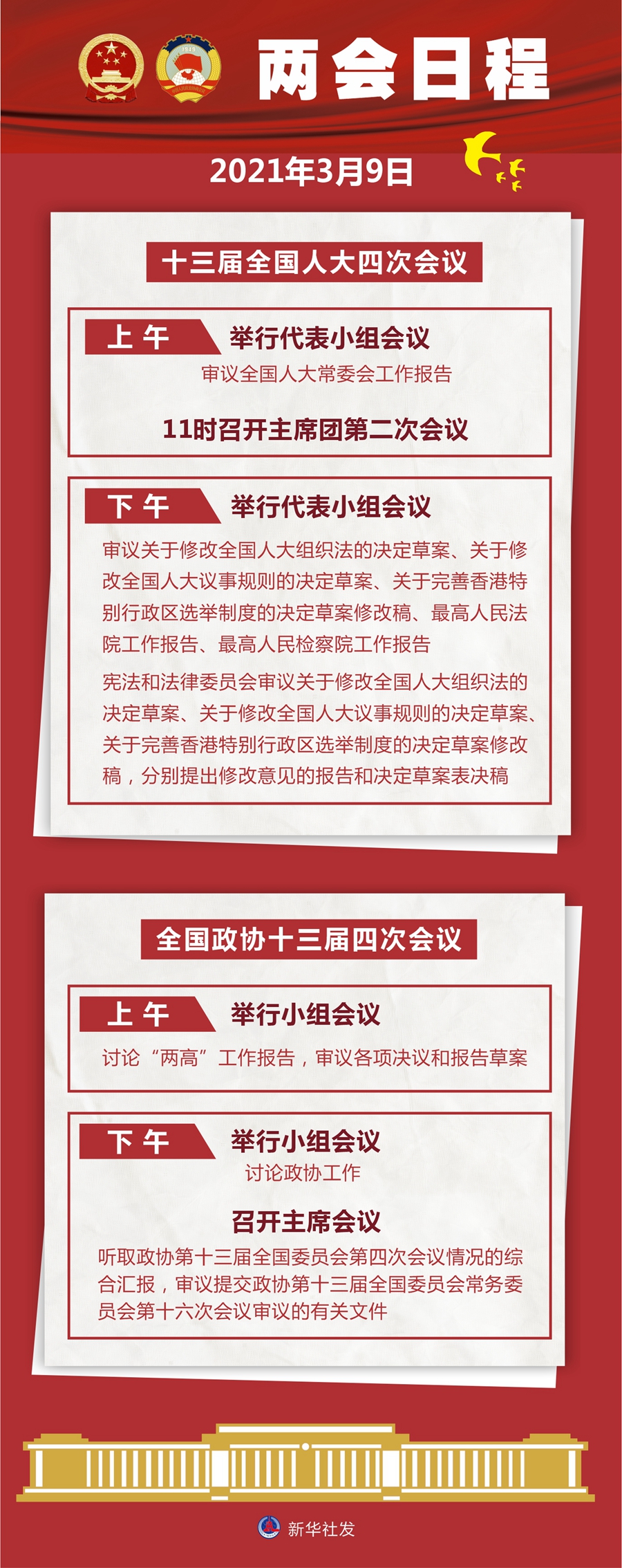 十三屆全國人大四次會議9日上午舉行代表小組會議,審議全國人大常委會工作報告;11時召開主席團(tuán)第二次會議。下午舉行代表小組會議,審議關(guān)于修改全國人大組織法的決定草案、關(guān)于修改全國人大議事規(guī)則的決定草案、關(guān)于完善香港特別行政區(qū)選舉制度的決定草案修改稿、最高人民法院工作報告、最高人民檢察院工作報告;憲法和法律委員會審議關(guān)于修改全國人大組織法的決定草案、關(guān)于修改全國人大議事規(guī)則的決定草案、關(guān)于完善香港特別行政區(qū)選舉制度的決定草案修改稿,分別提出修改意見的報告和決定草案表決稿。