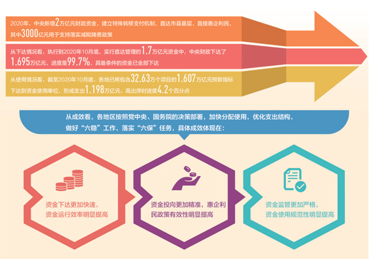 今年3月初,財政部調(diào)研小組發(fā)布的《2020年中國財政政策執(zhí)行情況報告》顯示,直達資金執(zhí)行情況總體良好,“僅用20天時間,就將95%的中央直達資金下達市縣基層,省級財政細化下達時間平均只有1周,速度前所未有。”“目前,財政直達資金預(yù)算下達已經(jīng)完成,其中1.56萬億元資金已經(jīng)投入使用,預(yù)算執(zhí)行情況總體良好,重點領(lǐng)域支出保障有力,效果明顯。”