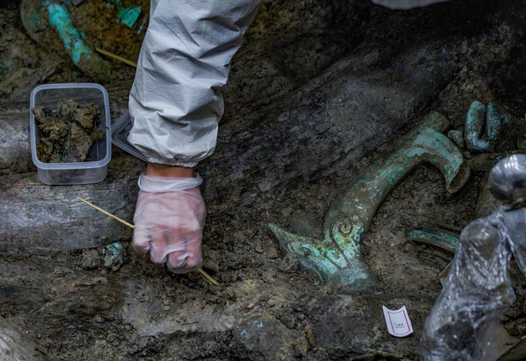 一鍬一鏟,叩問(wèn)大地緘默。一擔(dān)一籃,剝除歷史塵封。三星堆遺址4號(hào)坑發(fā)掘人員許丹陽(yáng),每天的大部分工作就是拿著各種小刷子小鏟子刨土挖土。許丹陽(yáng)也是一位90后,生于95年的他,去年從北京大學(xué)考古文博學(xué)院研究生畢業(yè)后,進(jìn)入到四川省文物考古研究院工作。此次“入坑”三星堆,已經(jīng)是他的第二次。在2018年時(shí),正在攻讀研究生的許丹陽(yáng)就已經(jīng)來(lái)過(guò)三星堆進(jìn)行學(xué)術(shù)研究,而這次剛參加工作就加入了三星堆祭祀?yún)^(qū)新一輪考古的隊(duì)伍,負(fù)責(zé)最先啟動(dòng)的4號(hào)坑發(fā)掘,他感覺(jué)正逢其時(shí)。