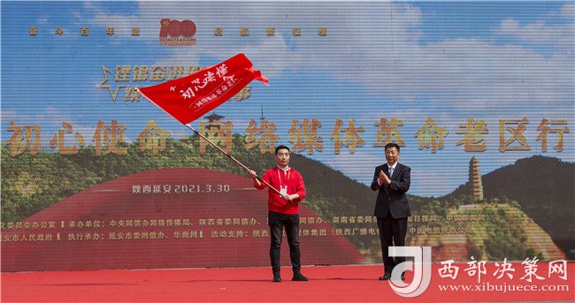 主會(huì)場(chǎng)活動(dòng)結(jié)束后,陜西分會(huì)場(chǎng)“在這里讀懂初心使命——網(wǎng)絡(luò)媒體革命老區(qū)行”網(wǎng)絡(luò)主題采訪活動(dòng)在延安寶塔山游客廣場(chǎng)正式啟動(dòng)。趙剛在分會(huì)場(chǎng)啟動(dòng)儀式上講話并向采訪團(tuán)授旗。陜西省委網(wǎng)信辦主任鮑永能主持啟動(dòng)儀式。中央網(wǎng)信辦網(wǎng)絡(luò)傳播局副局長(zhǎng)邵波濤,陜西省委網(wǎng)信辦副主任王利參加啟動(dòng)儀式。延安市委副書記、政法委書記嚴(yán)漢平在啟動(dòng)儀式上致辭。媒體團(tuán)代表中國(guó)新聞網(wǎng)負(fù)責(zé)人吳慶才作表態(tài)發(fā)言。