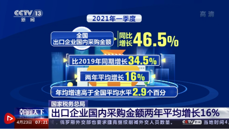 2021年一季度,海外需求復(fù)蘇繼續(xù)拉動(dòng)我國出口快速增長,全國出口企業(yè)國內(nèi)采購金額同比增長46.5%,比2019年同期增長34.5%,兩年平均增長16%,年均增速高于全國平均水平2.9個(gè)百分點(diǎn)。
