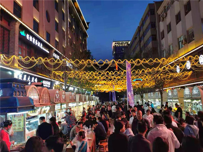 下午六七點(diǎn),這里一百多個(gè)商戶(hù)支起攤位,羊蹄、羊雜碎、洋芋擦擦、洋芋沫沫、雜面等三十多種特色小吃冒著熱氣。街道人流如織,直到凌晨?jī)牲c(diǎn)依舊燈火通明。