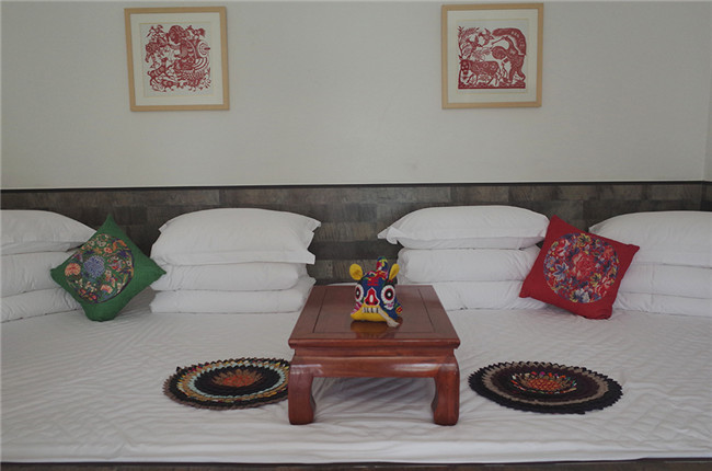 “大到喝茶的桌椅,小到墻上的剪紙,都是找專(zhuān)門(mén)手藝人做的。”小雅指著“炕”上的花坐墊說(shuō),這也是拿小孩不穿的布帛縫起來(lái)的,展現(xiàn)陜北特色的“百家衣”風(fēng)格。陜北炕比較冰冷,她們就用木頭把炕包起來(lái),再鋪上軟墊。