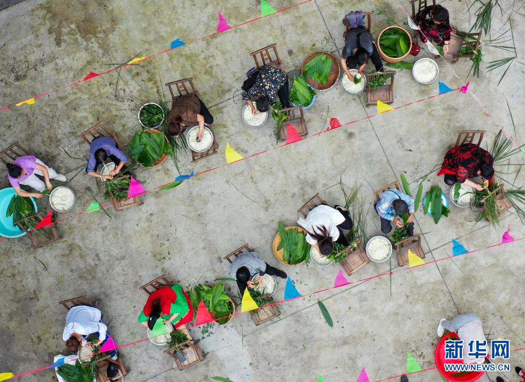 6月2日,貴州省銅仁市玉屏侗族自治縣亞魚鄉(xiāng)郭家灣村村民參加包粽子比賽(無人機(jī)照片)。新華社發(fā)(胡攀學(xué)攝)