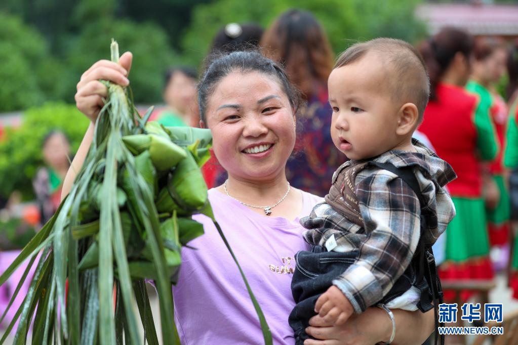 6月2日,貴州省銅仁市玉屏侗族自治縣亞魚鄉(xiāng)郭家灣村村民展示自己包的粽子。新華社發(fā)(胡攀學(xué)攝)