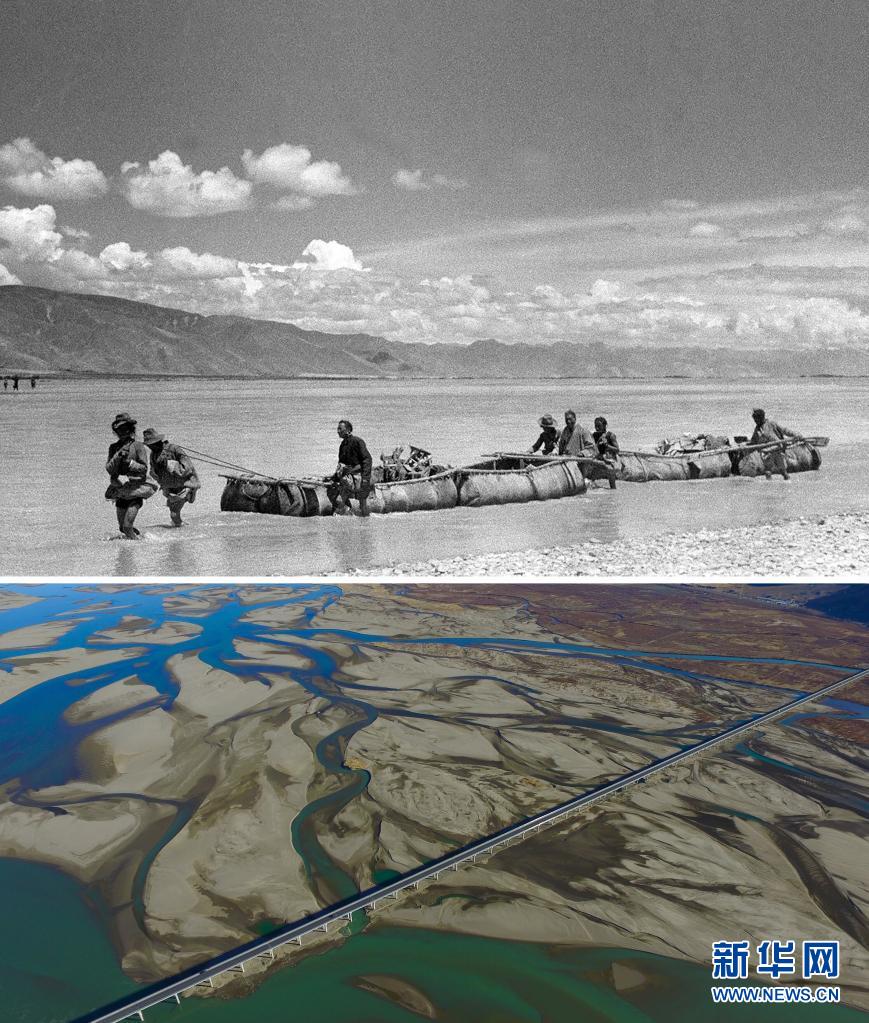 拼版照片:上圖是20世紀(jì)50年代,雅魯藏布江上游的牛皮船載著土特產(chǎn)和糧食沿江運輸至西藏東部(新華社發(fā) 趙奇攝);下圖是2016年12月11日拍攝的位于西藏山南市扎囊縣境內(nèi)的扎囊特大橋(新華社記者普布扎西攝)。新華社發(fā)