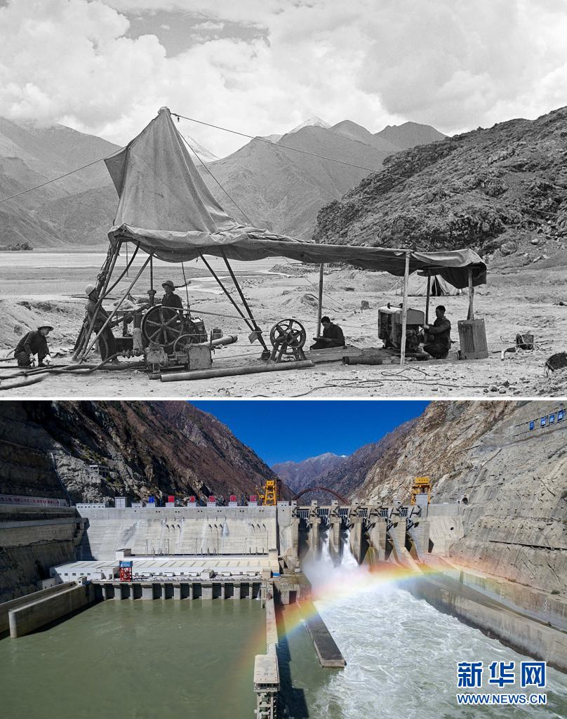 拼版照片:上圖是20世紀(jì)50年代,西藏工程勘察隊鉆探組在選定的拉薩水力發(fā)電廠廠址,用從東北雞西礦務(wù)局機(jī)械總廠運來的鉆探機(jī)進(jìn)行鉆探(新華社記者任用昭攝);下圖是2018年10月26日拍攝的西藏首座大型水電站——藏木水電站(新華社發(fā) 董志雄攝)。新華社發(fā)