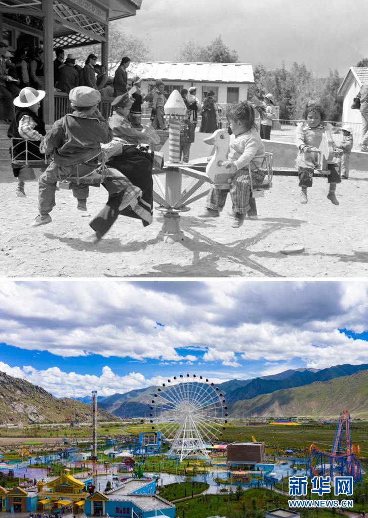 拼版照片:上圖是20世紀(jì)80年代,日喀則幼兒園的孩子們在玩動物圓盤轉(zhuǎn)椅(新華社記者程曦攝);下圖是2021年8月9日拍攝的拉薩市象雄美朵游樂園(新華社記者張汝鋒攝,無人機(jī)照片)。新華社發(fā)