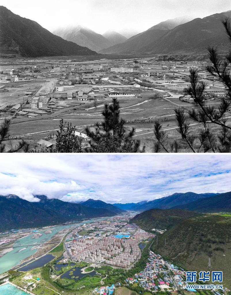 拼版照片:上圖是20世紀(jì)60年代的日喀則(資料照片);下圖是2021年8月9日拍攝的日喀則(新華社記者覺果攝)。新華社發(fā)