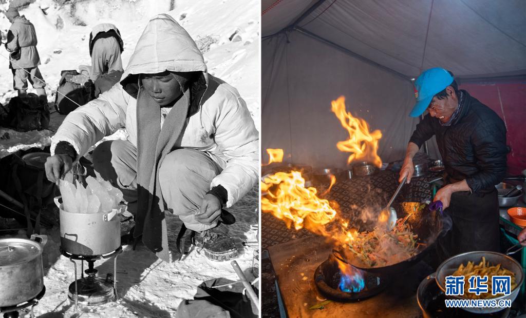 拼版照片:左圖是20世紀(jì)60年代,我國登山隊員在海拔5700米冰川上宿營時融冰煮飯(新華社記者陳宗烈攝);右圖是2020年5月10日,廚師在海拔6500米的前進(jìn)營地炒菜(新華社記者孫非攝)。新華社發(fā)