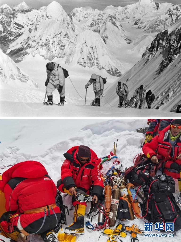 拼版照片:上圖是1960年,登山隊隊員在海拔7000米以上的雪坡上前進(jìn)(資料照片);下圖是2020年5月21日拍攝的2020珠峰高程測量登山隊員所使用的現(xiàn)代登山設(shè)備(新華社特約記者拉巴攝)。新華社發(fā)