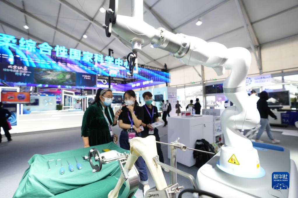 參觀者在2021中關(guān)村論壇展覽(科博會(huì))參觀展出的一款適用于全膝關(guān)節(jié)置換手術(shù)的機(jī)器人。(9月25日攝)。新華社記者 鞠煥宗 攝