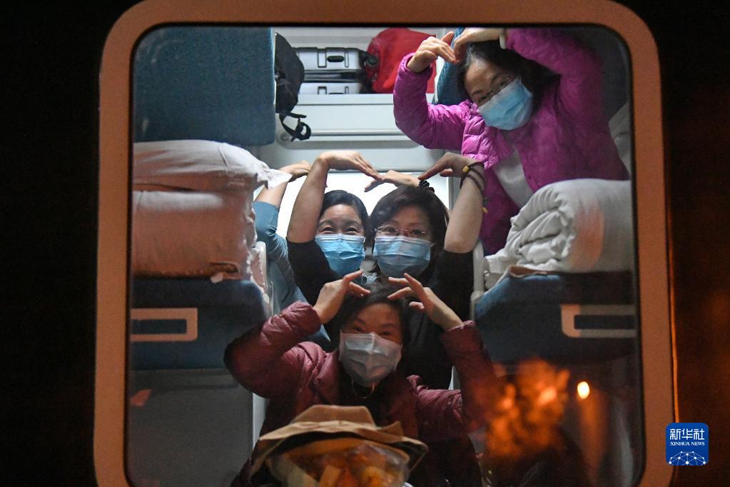 10月29日,一名滯留游客離開(kāi)額濟(jì)納旗時(shí),在列車(chē)車(chē)廂里用雙手比劃出“愛(ài)心”。新華社發(fā)(王磊 攝)