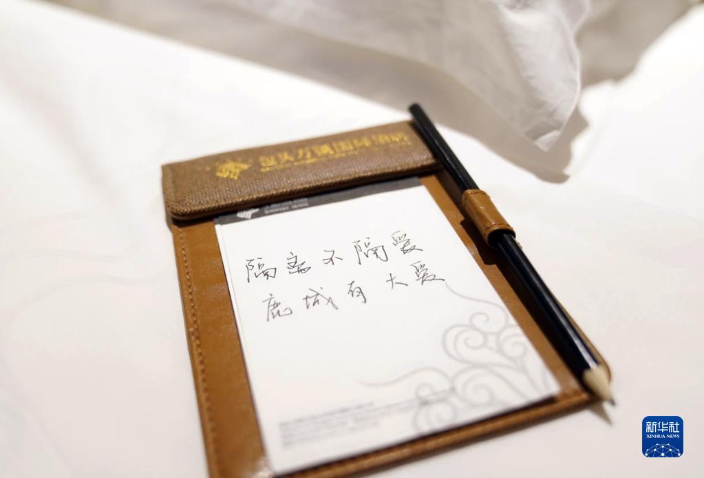 10月29日,一名轉(zhuǎn)移到包頭市的滯留額濟(jì)納旗游客,在酒店里留言“隔離不隔愛(ài) 鹿城有大愛(ài)”。新華社發(fā)
