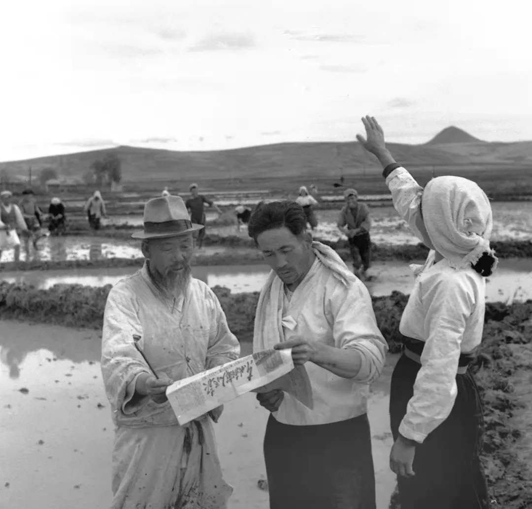 1954年6月26日,“中華人民共和國(guó)憲法草案”公布的消息傳到了吉林省延邊朝鮮族自治區(qū),正在田間勞動(dòng)的崔竹松農(nóng)業(yè)生產(chǎn)合作社社員們爭(zhēng)相趕來(lái)閱讀公布憲法草案的好消息。新華社發(fā)