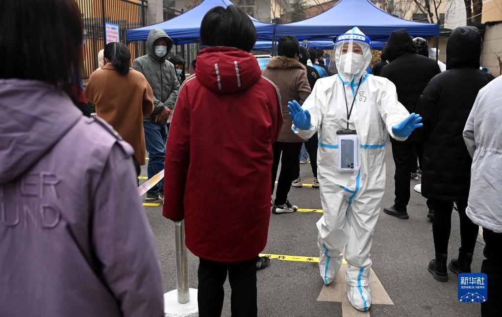 12月23日,西安市新城區(qū)一小區(qū),核酸檢測(cè)人員維持秩序。新華社記者 劉瀟 攝