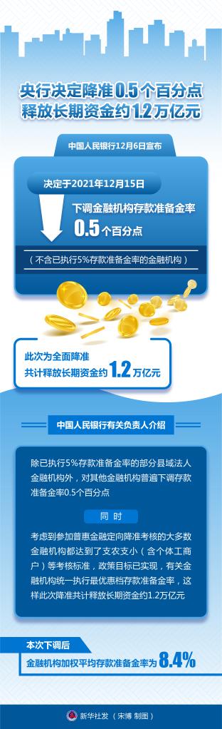 中國(guó)人民銀行12月6日宣布,決定于2021年12月15日下調(diào)金融機(jī)構(gòu)存款準(zhǔn)備金率0.5個(gè)百分點(diǎn)(不含已執(zhí)行5%存款準(zhǔn)備金率的金融機(jī)構(gòu))。此次為全面降準(zhǔn),共計(jì)釋放長(zhǎng)期資金約1.2萬億元。新華社發(fā) 宋博 制圖