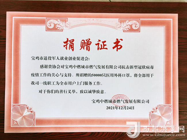 西部決策網(wǎng)訊 (任書彥)12月24日,寶雞市退役軍人就業(yè)創(chuàng)業(yè)促進(jìn)會向?qū)氹u中燃城市燃?xì)獍l(fā)展有限公司無償捐贈醫(yī)用外科口罩50000只,以全力支持寶雞市抗疫防疫工作。