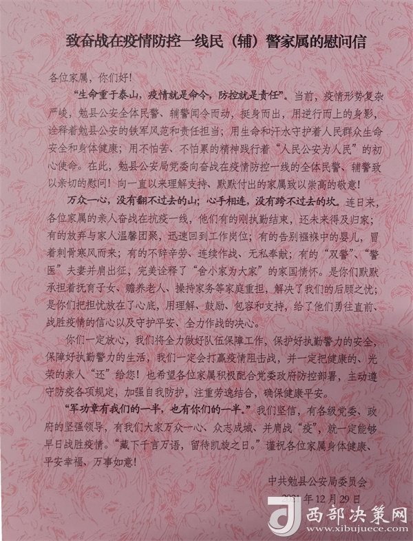 西部決策網(wǎng)訊為表達(dá)對奮戰(zhàn)在疫情防控一線民輔警家屬的崇高敬意,感謝他們對公安工作的理解和支持,12月29日下午,勉縣公安局組織開展疫情防控一線民輔警家屬慰問活動(dòng),為家屬們送去慰問信和慰問品,并通過他們向奮戰(zhàn)在一線的民輔警傳遞勉縣公安局黨委的溫暖和關(guān)愛,以更加飽滿的熱情、昂揚(yáng)的斗志投入到疫情防控工作中。
