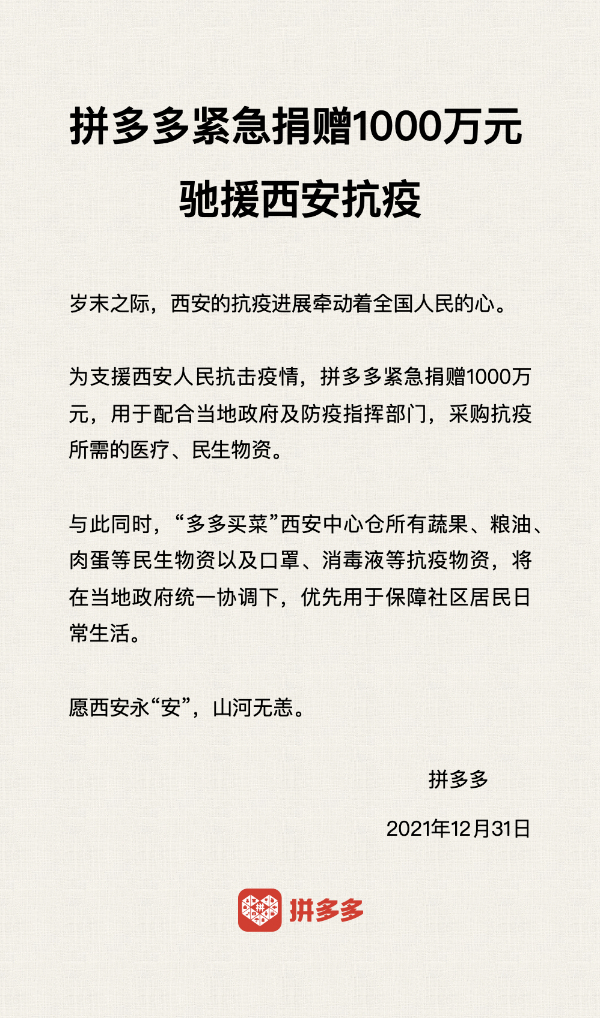 為支援西安人民抗擊疫情,12月31日,拼多多宣布捐贈(zèng)1000萬元,用于配合當(dāng)?shù)卣胺酪咧笓]部門,采購抗疫所需的醫(yī)療、民生物資。