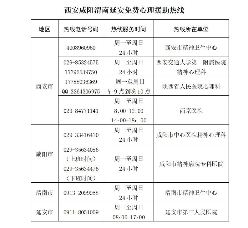 省新冠肺炎疫情醫(yī)療救治心理干預(yù)專家組,組建心理援助熱線工作團隊,24小時為疫情心理求助者提供心理援助服務(wù)。同時,省衛(wèi)生健康委會同省政務(wù)服務(wù)中心在省12320衛(wèi)生熱線開通疫情心理援助熱線專席,依托陜西12345對全省有關(guān)疫情心理干預(yù)的訴求進行引導和分轉(zhuǎn)。