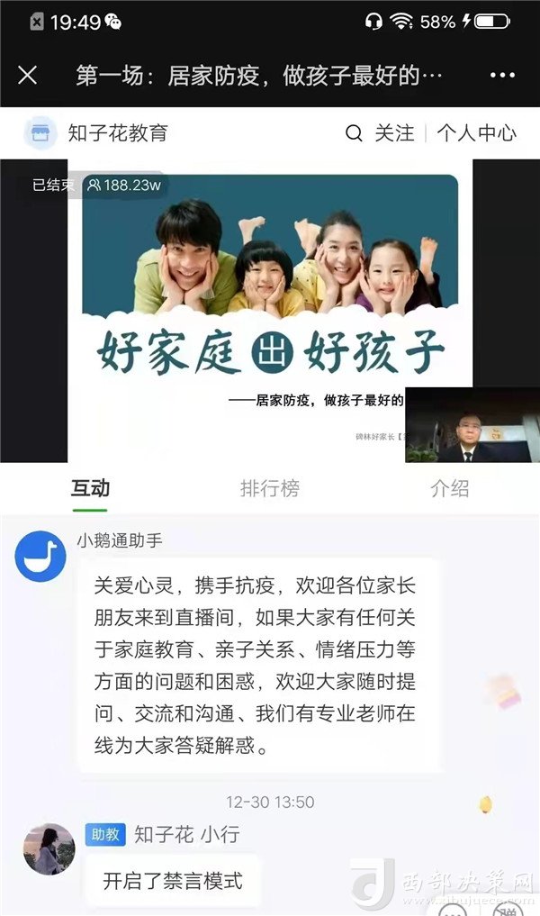 西部決策網(wǎng)訊 面對(duì)當(dāng)前嚴(yán)峻的疫情防控形勢(shì),為了貫徹落實(shí)渭南潼關(guān)縣教科局“停課不停學(xué)”的工作部署,潼關(guān)縣城關(guān)二中全面開展了線上教育教學(xué)活動(dòng)。為了更好的幫助全校師生及學(xué)生家長(zhǎng)保持平和心態(tài),處理好“停課不停學(xué)”中,教師、學(xué)生及學(xué)生家長(zhǎng)可能出現(xiàn)的心理問(wèn)題,進(jìn)行有效的心理調(diào)試,潼關(guān)縣城關(guān)二中組織全校師生及學(xué)生家長(zhǎng)觀看了陜西省教育廳舉辦的《心理健康暨家庭教育》線上直播講座,各位心理專家根據(jù)不同的人群進(jìn)行了正確有效的心理輔導(dǎo)與科學(xué)的指導(dǎo),為全體師生和學(xué)生家長(zhǎng)筑起了抗疫“心”防線。