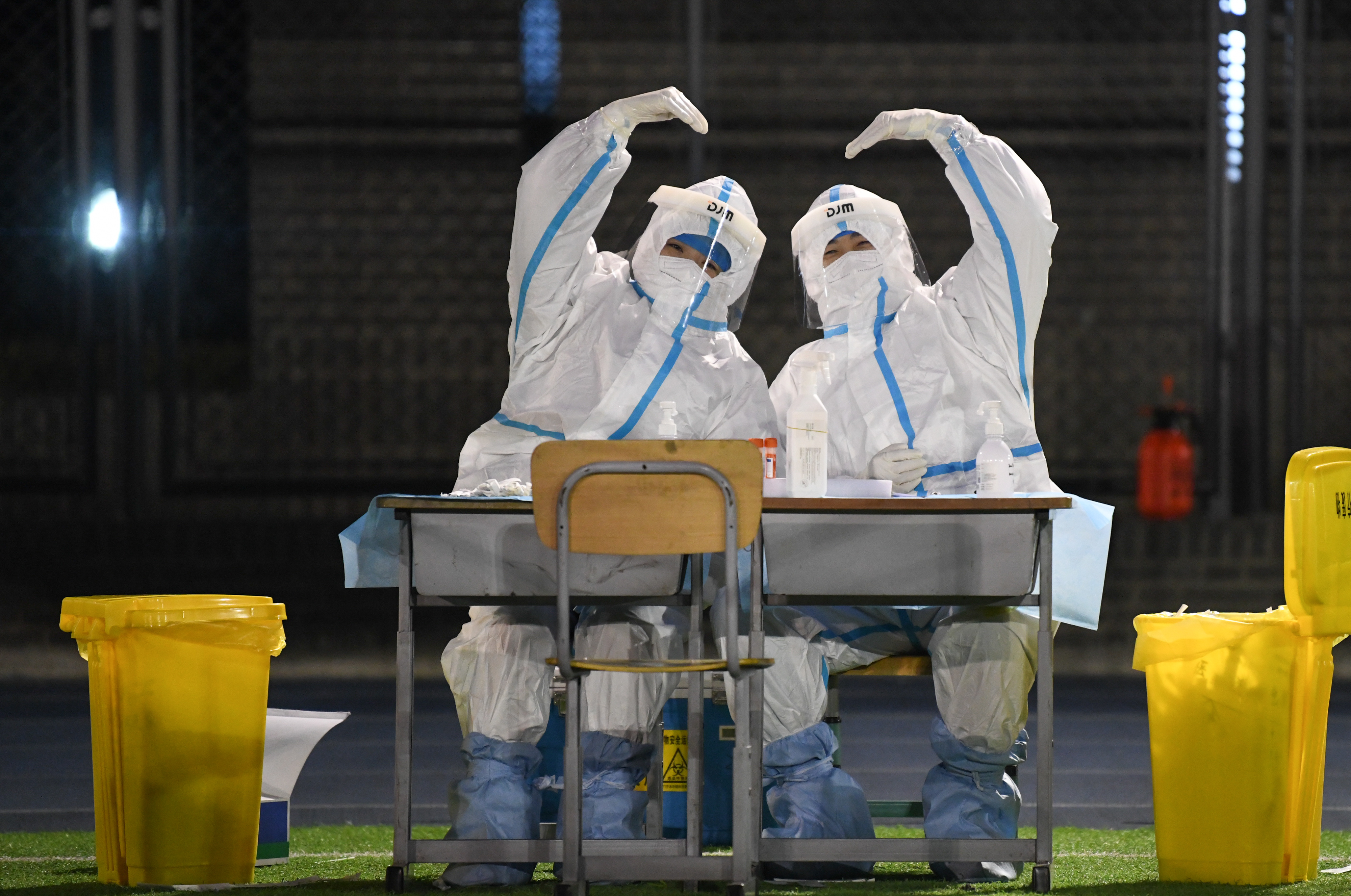 2022年1月10日凌晨,在天津市南開區(qū)鼓樓街道中營小學(xué)核酸檢測點(diǎn),兩名醫(yī)務(wù)人員做出“比心”手勢。新華社記者 孫凡越 攝