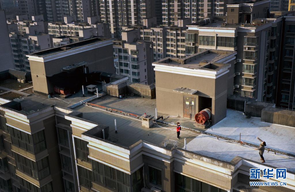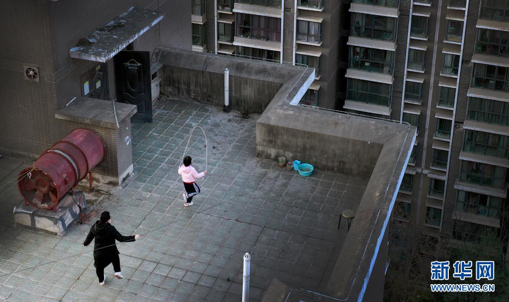 1月14日,西安市一小區(qū)居民在樓頂上跳繩鍛煉(無人機照片)。新華社記者 陶明 攝
