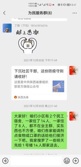 看著手里拎的幾顆白菜、蘿卜、西紅柿,我感到慚愧難當,作為一名黨員、一名下沉干部,實在是失職,沒有履行好“民之所憂,我必念之;民之所盼,我必行之”的使命擔當。投送完愛心菜到家后,我立即在群里倡議小區(qū)下沉干部對1-3-2302的務(wù)工人員開展愛心救助活動,并從自家的抗疫儲備物資里勻出了2袋子蔬菜、豆腐乳、魚醬罐頭、口罩、水果等物資,并附上了溫馨小紙條,寫上我的聯(lián)系電話,鼓勵他們堅定克服困難的信心和決心。第二天,社區(qū)領(lǐng)導(dǎo)、小區(qū)鄰居們得知情況后,紛紛伸出援助之手,不到半小時,鍋灶有了、菜刀案板有了、糧食蔬菜也都有了…,社區(qū)的慰問品也送來了。大伙不僅給他們送去了物資,更送去了關(guān)心和安慰,他們的生活起居也迅速融入了小區(qū)大家庭,業(yè)主群里每天都有人對他們噓寒問暖,他們也經(jīng)常在業(yè)主群曬他們做的川味美食。他們私下跟我說,這幾年,他們在湖北、新疆等地都遇到過疫情,但最讓他們感動的還是西安,黨和政府的細致安排、西安人民的熱情相助,讓他們在他鄉(xiāng)異地孤立無援時,第一次感到不慌了。