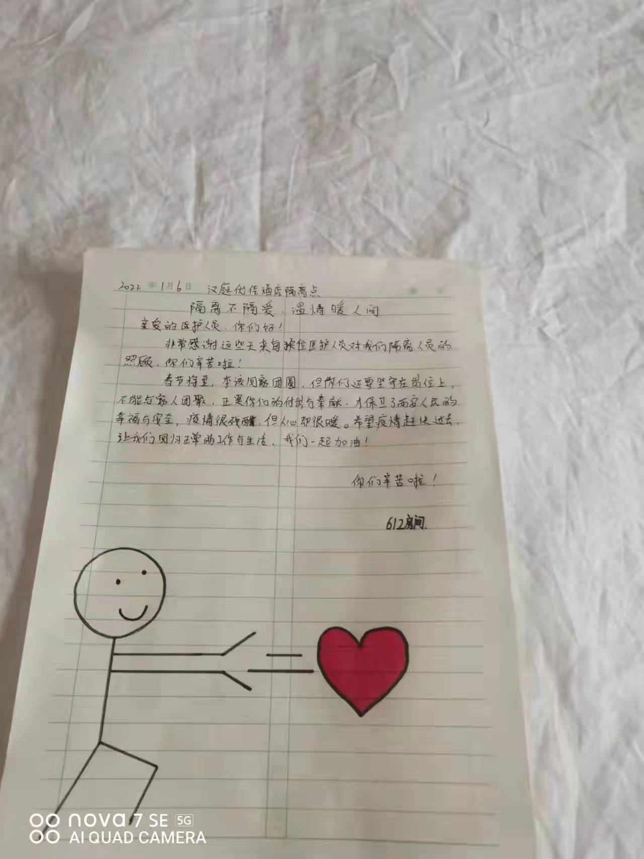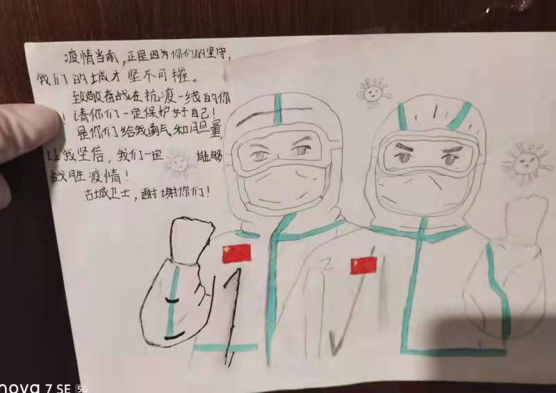一幅幅手抄報,一封封感謝信,一條條群留言,都在記錄著一個個勇毅且溫情的抗疫瞬間。“今天是我被隔離的最后一天,收拾好書包和小行李箱,準(zhǔn)備回家了,看著剩余的水果、零食,此刻心里不止是歡喜和激動,還有一絲不舍……”一名小學(xué)生在感謝信中寫到:“接到老師的通知,我們要集體隔離,內(nèi)心還有點害怕,不知該怎么辦,來到酒店后,看到張張和藹可親的臉,我的心放下了,你們?yōu)槲覀儾珊怂?、送飯菜,讓我感到溫暖,感謝強大的祖國,我們一定好好學(xué)習(xí),長大做一個對社會有用的人”。據(jù)介紹,隔離期間,有四名12歲的學(xué)生是獨自隔離,沒有家人的陪護(hù),在工作人員每天的問候中,他們懂事有禮貌,只要求工作人員幫他們打印作業(yè),每天在房間堅持看書學(xué)習(xí)。