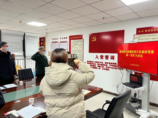 2022年1月6日,商貿(mào)園辦疫情防控片區(qū)臨時(shí)黨委在第一次擴(kuò)大會議上重溫入黨誓詞。浐灞融媒體中心供圖