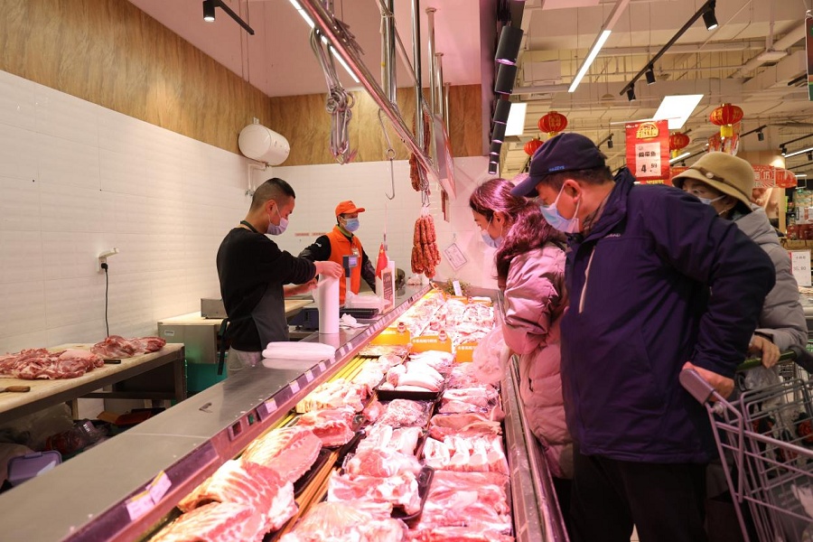 在蔬菜區(qū)、水產(chǎn)區(qū)、肉類區(qū),工作人員稱重、打包,忙得不亦樂乎。“今天一大早就有不少群眾來,各種肉類和火鍋食材賣得很快,還有顧客一次性買了800多元的肉卷。大家都說要多買點菜,好好吃頓火鍋。我們工作人員現(xiàn)場切肉、殺魚,也是忙得不可開交。”該超市一汪姓負責人表示,從上午的情況看,群眾購買商品的意愿都很強,大家對各類商品的需求都很大。