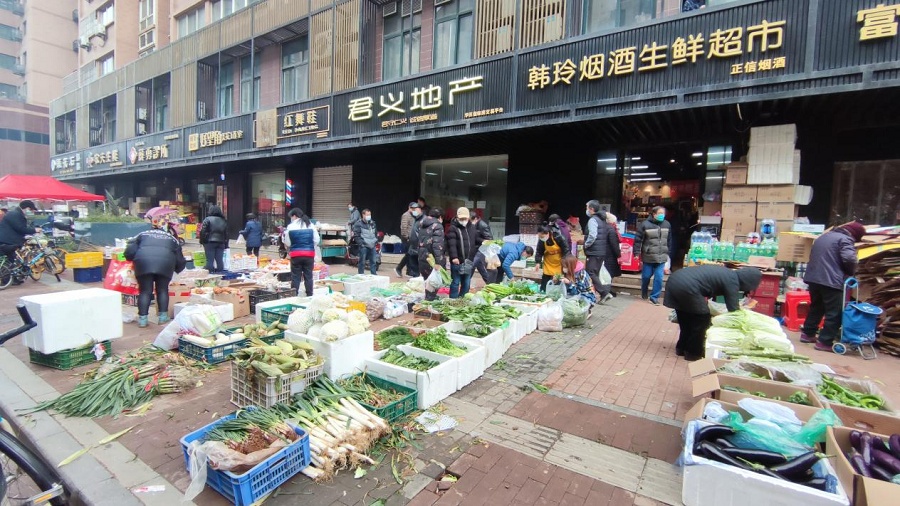 走出超市,漫步街邊,沿街陸續(xù)開業(yè)的小商鋪,同樣展現(xiàn)著這個城市久違的活力。在楓葉廣場2期小區(qū)西南門,正在營業(yè)的蔬菜店、水果店生意很是不錯,新鮮的茄子、青筍、白菜用紙箱裝著,被整整齊齊地擺在沿街人行道上,不少市民正在選購心儀的菜品。
