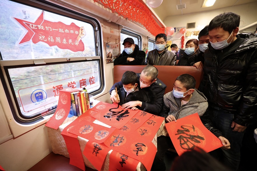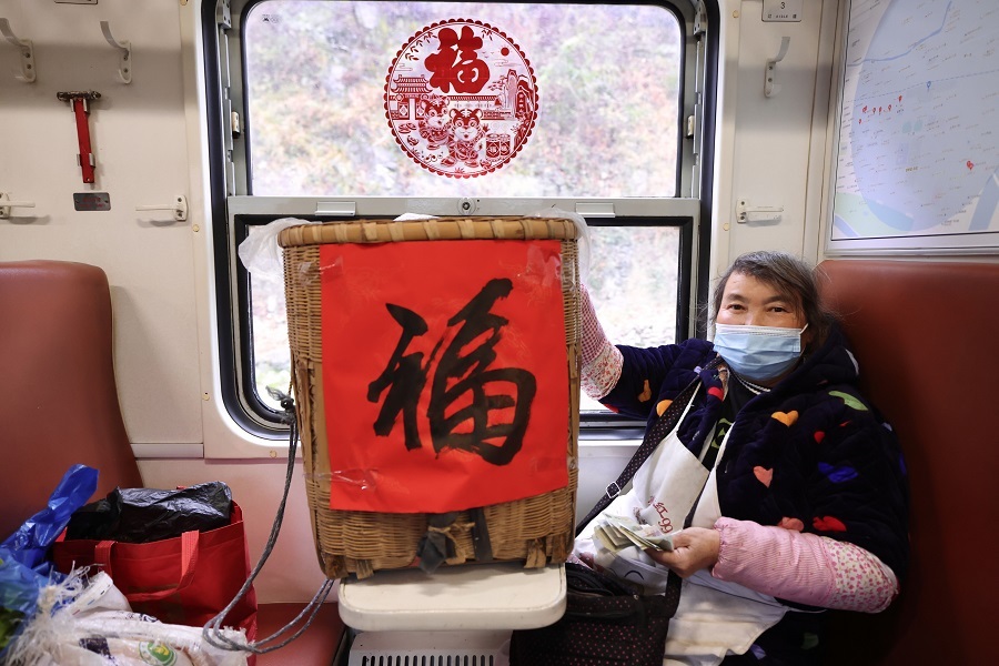 “各位老鄉(xiāng),早上好,今天是農(nóng)歷小年,我們將舉行送祝?;顒?dòng)。”列車(chē)員衛(wèi)進(jìn)忠的話音剛落,就看見(jiàn)車(chē)廂里老鄉(xiāng)們急忙圍攏過(guò)來(lái)。他把寫(xiě)好的春聯(lián)送給身邊背著背簍的一位老人,將一張福字貼在了背簍上。拿到對(duì)聯(lián)、福字的老人滿臉笑容,連忙道謝。“火車(chē)快開(kāi), 別讓我等待,火車(chē)快開(kāi),請(qǐng)你趕快送我到遠(yuǎn)方家鄉(xiāng)……”在與旅客互動(dòng)中,列車(chē)員李?lèi)?ài)民激情演唱歌曲《火車(chē)快開(kāi)》,送去列車(chē)工作人員的新春祝福,引來(lái)旅客們陣陣掌聲。