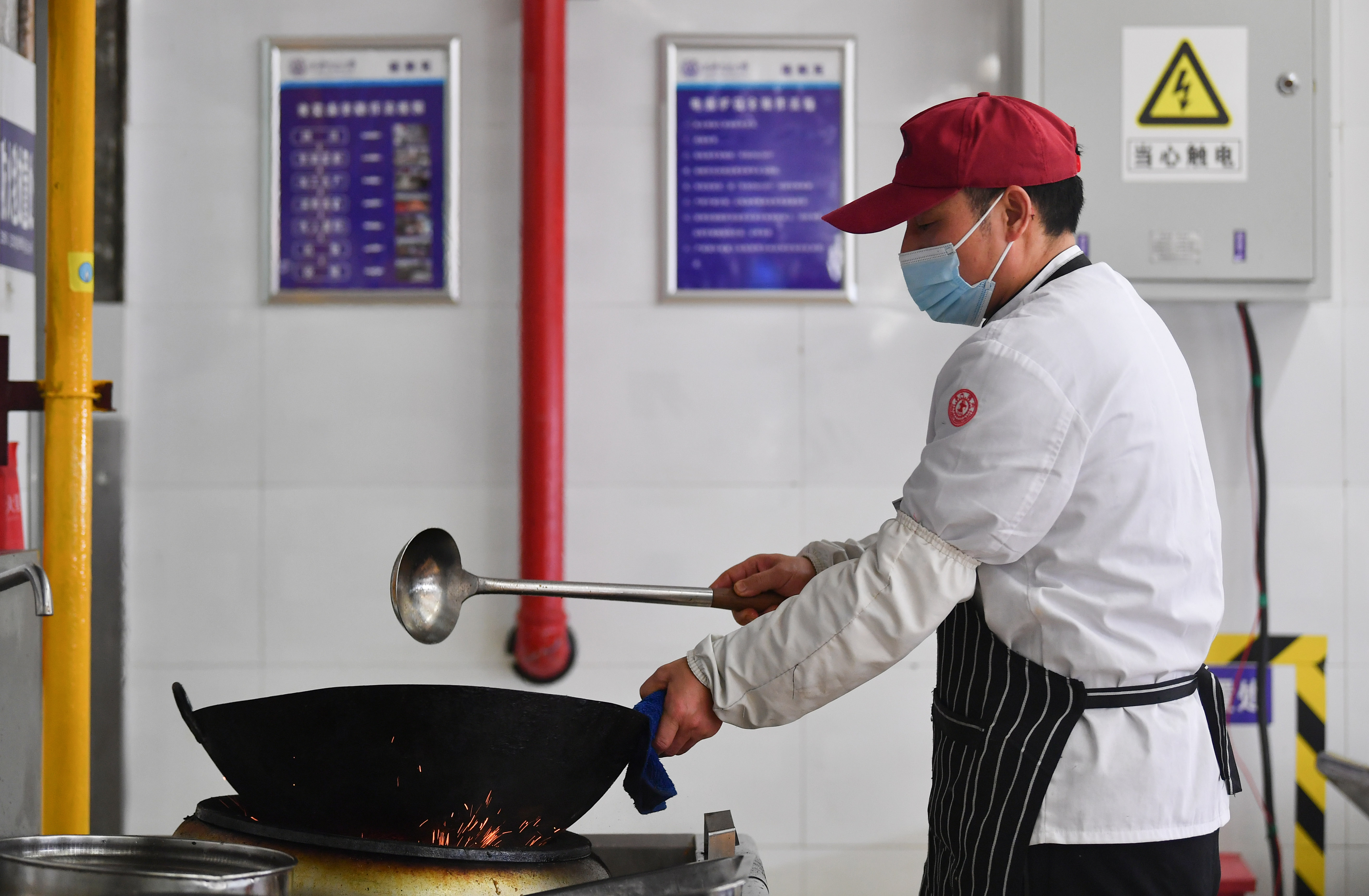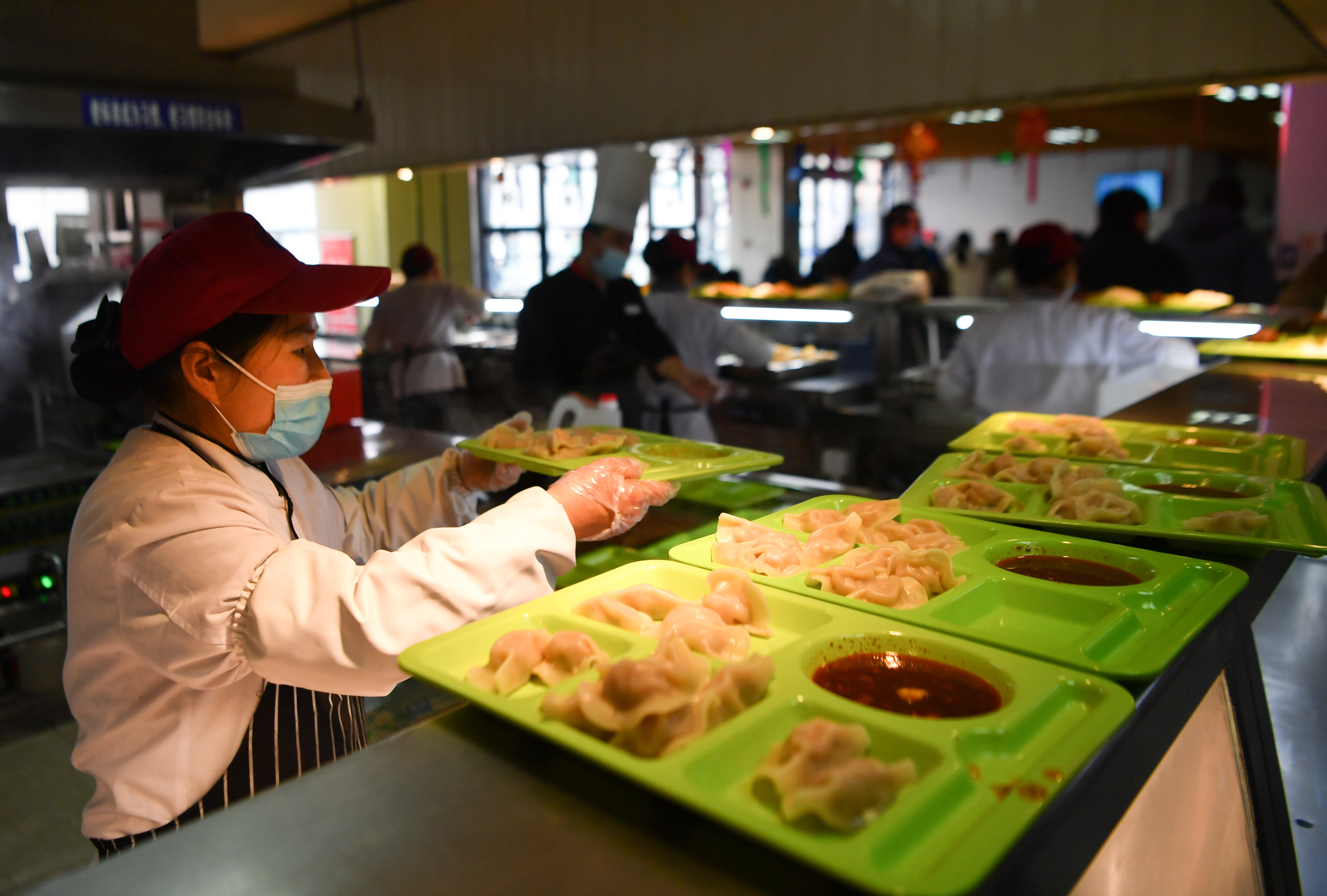 1月29日,工作人員在西安交通大學興慶校區(qū)校園食堂準備午餐。新華社記者 張博文 攝