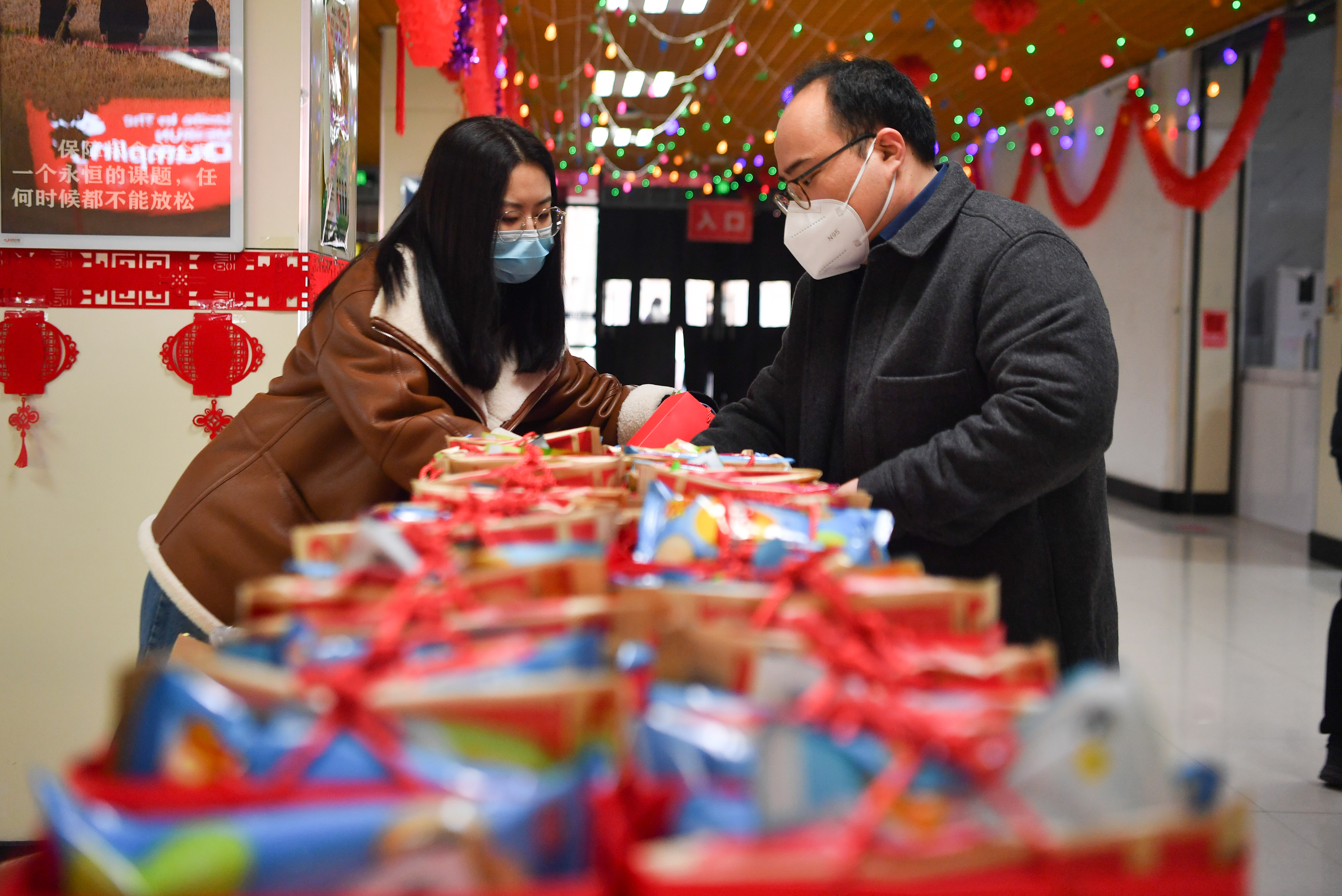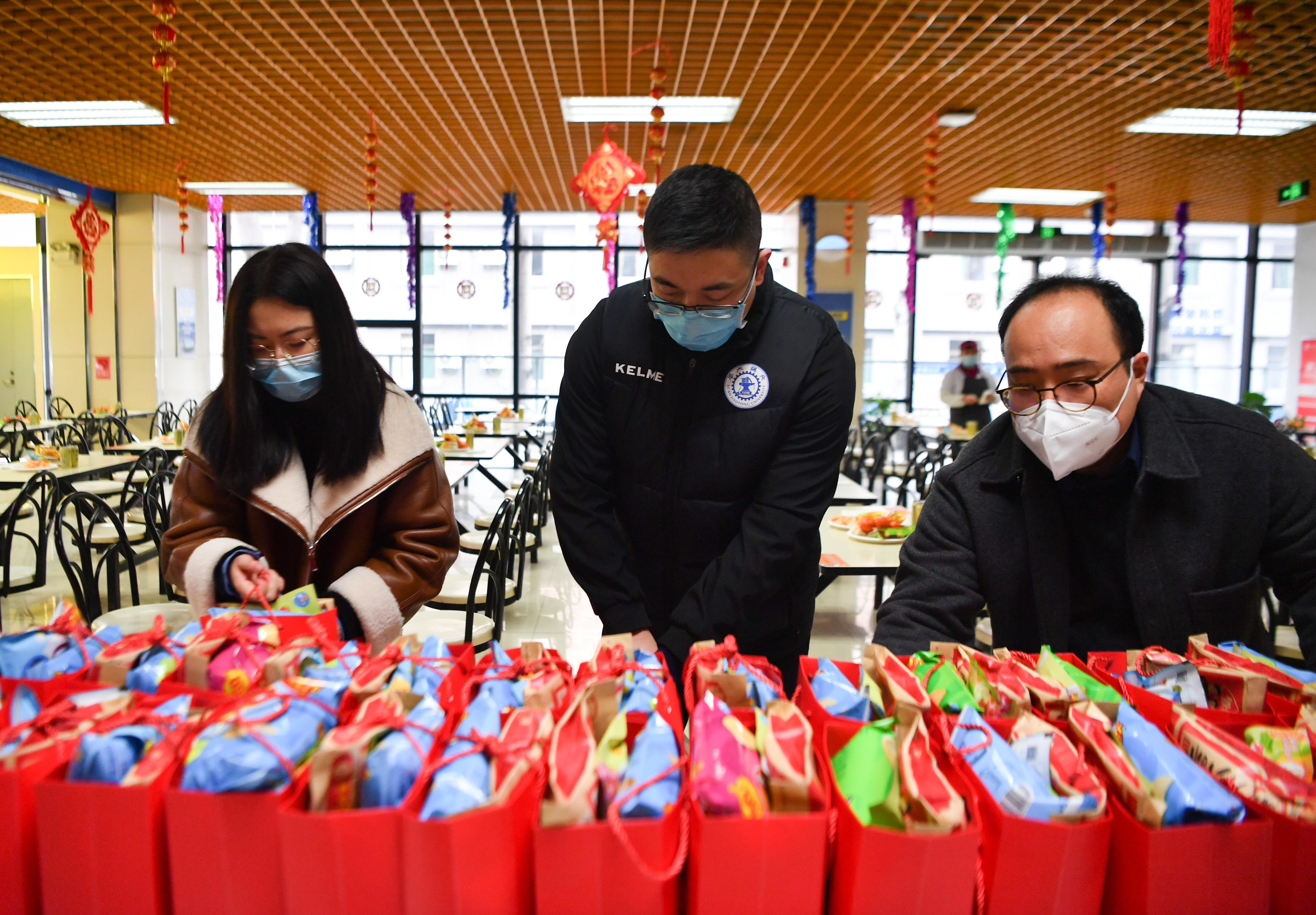 1月29日,工作人員在西安交通大學興慶校區(qū)整理為留校學生發(fā)放的禮包。新華社記者 張博文 攝