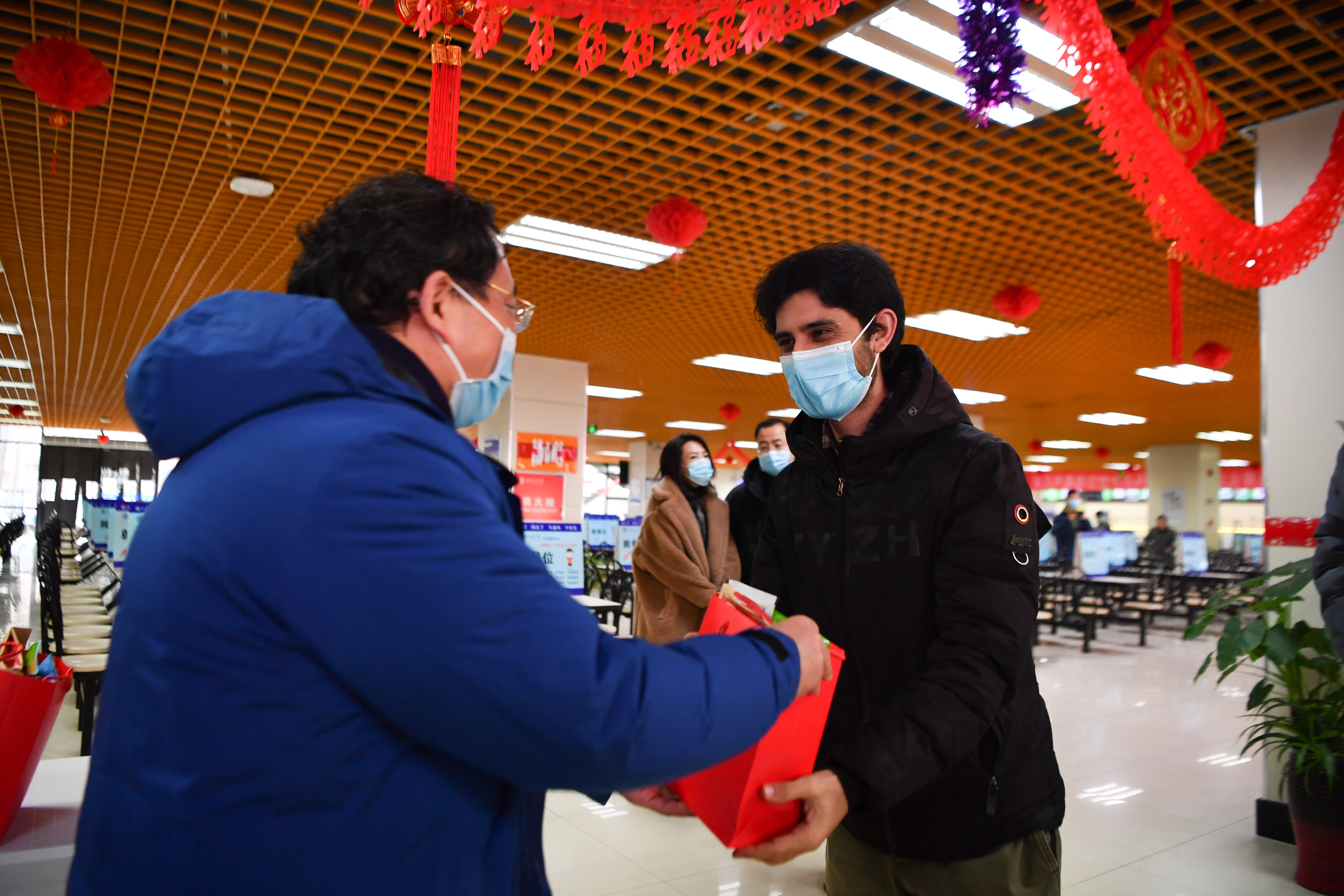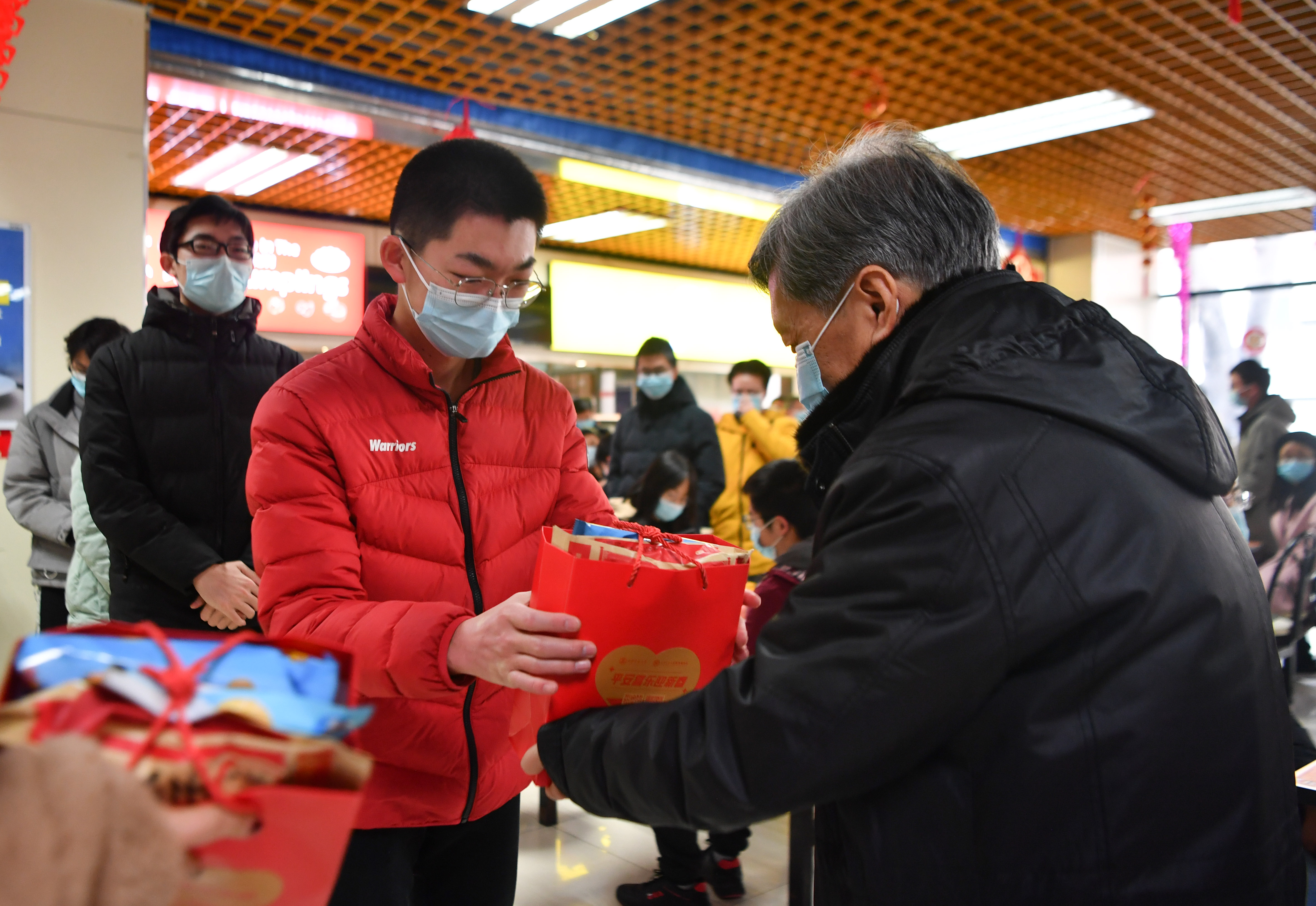 1月29日,西安交通大學留校學生(右)領(lǐng)取學校發(fā)放的禮包。新華社記者 張博文 攝