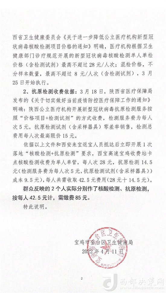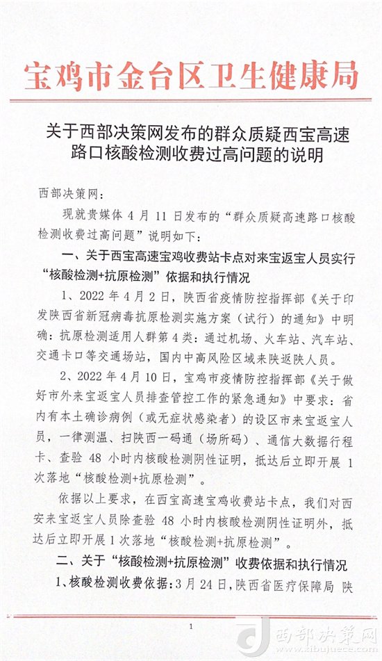 熱線回復(fù)|4月11日,寶雞市金臺區(qū)衛(wèi)生健康局就“群眾質(zhì)疑高速路口核酸檢測收費過高問題”向西部決策網(wǎng)回復(fù)并進(jìn)行了情況說明。具體內(nèi)容如下: