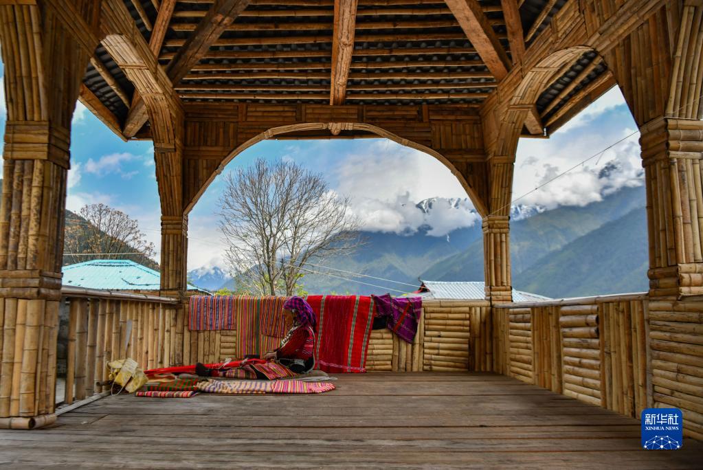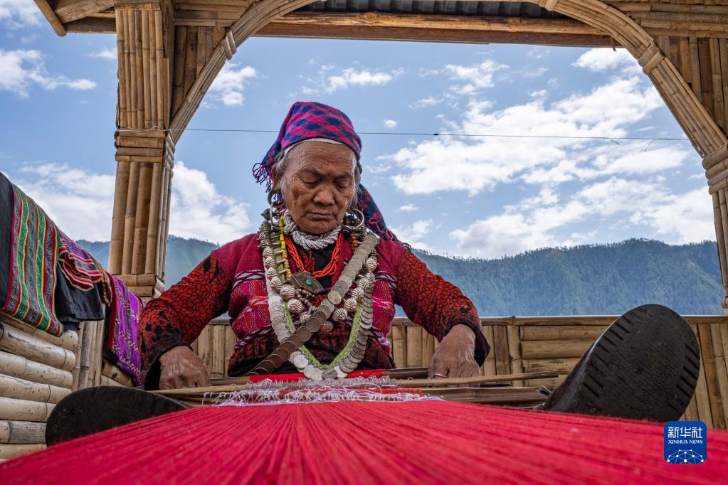 今年72歲的本央老人,是僜人服飾制作技藝西藏自治區(qū)級非遺傳承人。在西藏林芝市察隅縣沙瓊村,老人身著傳統(tǒng)的僜人服飾,在自家的涼亭里編織布料。