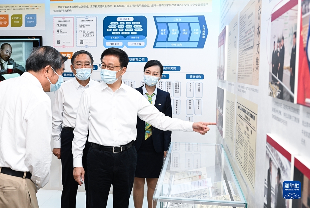 會(huì)前,韓正前往展廳,聽(tīng)取中國(guó)國(guó)際工程咨詢(xún)有限公司的發(fā)展歷程介紹,了解公司承擔(dān)基礎(chǔ)設(shè)施、重大工程等重點(diǎn)領(lǐng)域咨詢(xún)?nèi)蝿?wù)以及高端智庫(kù)建設(shè)等情況。