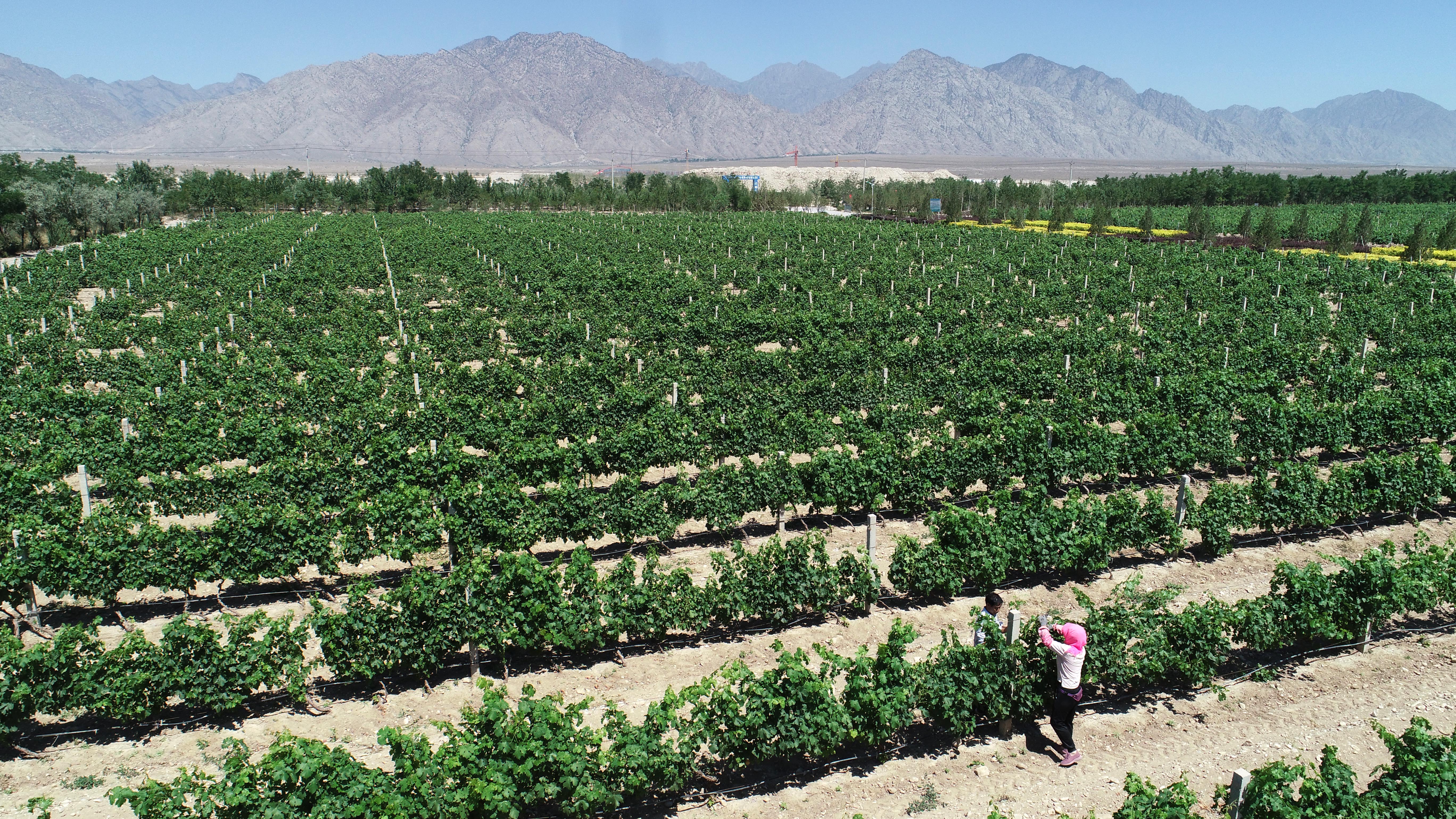 這是位于賀蘭山下的寧夏銀川市沃爾豐酒莊葡萄種植基地(無人機照片,6月14日攝)。新華社記者王鵬攝