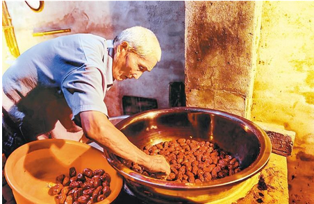 丁健榮亳無保留地講述了他制作甑糕的傳統(tǒng)工藝:甑糕原料是江米、大棗,其比例為每鍋江米10公斤,大棗3公斤,蒸制的每個步驟都有嚴(yán)格要求。第一步,選優(yōu)質(zhì)江米浸泡在清水里5個小時左右,紅棗、蜜棗浸泡2小時后備用;第二步,江米浸泡好后,用笊籬把江米撈出瀝水,倒入鋪好的篩子里再次瀝水;第三步,江米瀝干水后上蒸鍋燒1個小時把米撈出來滲水(適宜即可);第四步,先在鍋底鋪一層棗和蜜棗,再鋪一層米,共鋪三層;第五步,蓋好鍋,用調(diào)好的面糊涂在鍋的四周封閉;第六步,點火燒一個半小時,上氣后改為小火(鍋底不能斷火);第七步,第二天清晨5時加熱燒半小時關(guān)火開蓋。經(jīng)過這一系列程序加工后,熱氣騰騰的紅棗江米香味撲鼻而來,傳統(tǒng)甑糕就大功告成了。